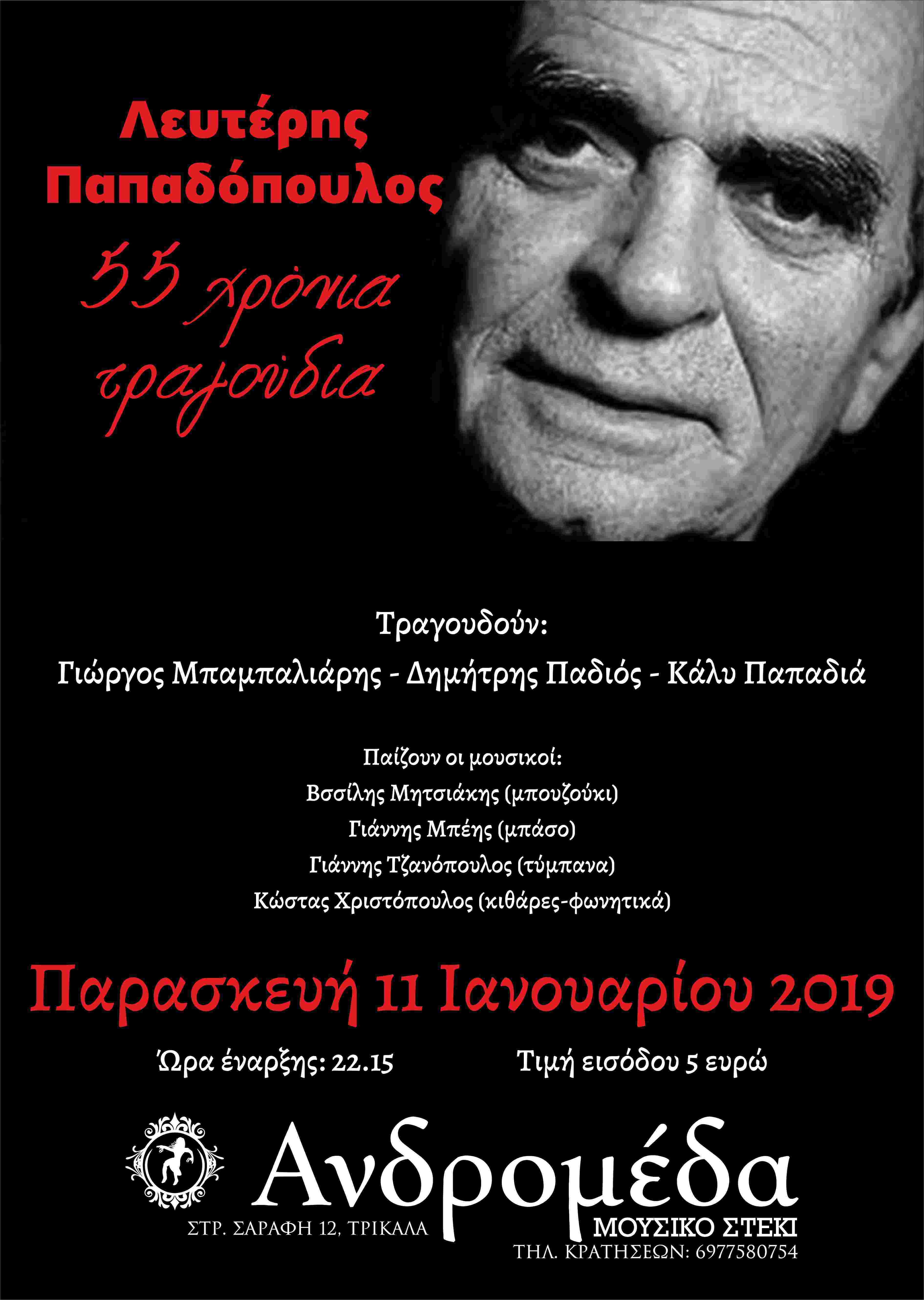 Ένα μουσικό αφιέρωμα στον κορυφαίο ποιητή-στιχουργό, αλλά και δημοσιογράφο, και συγγραφέα Λευτέρη Παπαδόπουλο, που φέτος συμπληρώνει 55 χρόνια μοναδικής παρουσίας και γόνιμης δημιουργίας στο ελληνικό τραγούδι.