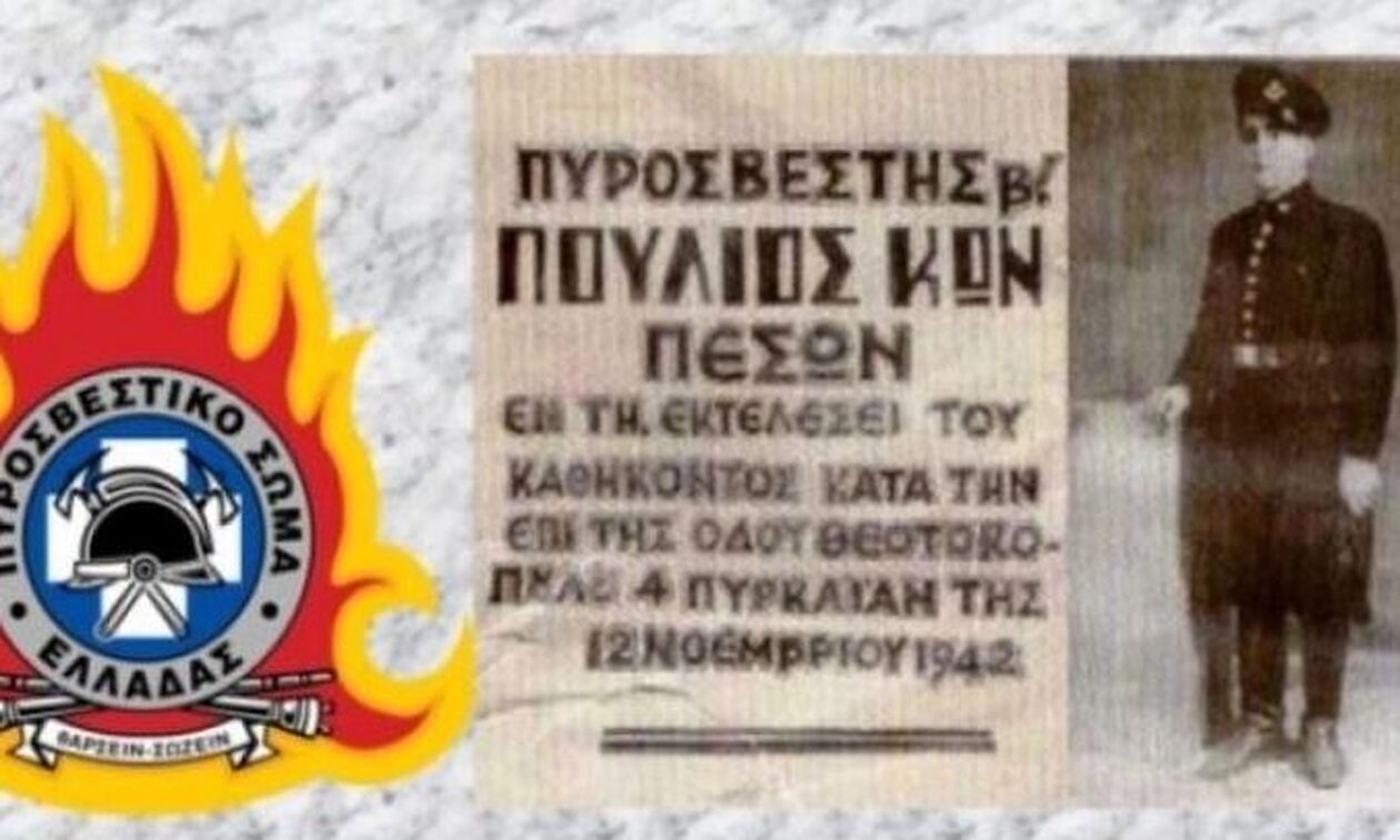 Η 12η Νοεμβρίου έχει καθιερωθεί ως μέρα τιμής για τους Πυροσβέστες μας. Η μέρα αυτή δεν έχει επιλεγεί τυχαία, αφού σαν σήμερα, το 1942 είχαμε τον πρώτο χαμό πυροσβέστη εν ώρα καθήκοντος. Του Κωνσταντίνου Πούλιο, του δόκιμο πυροσβέστη Β’ τάξεως, ο οποίος σκοτώνεται σε ηλικία 26 ετών και αφήνει πίσω του γυναίκα και ένα αγοράκι μόλις 7 μηνών.