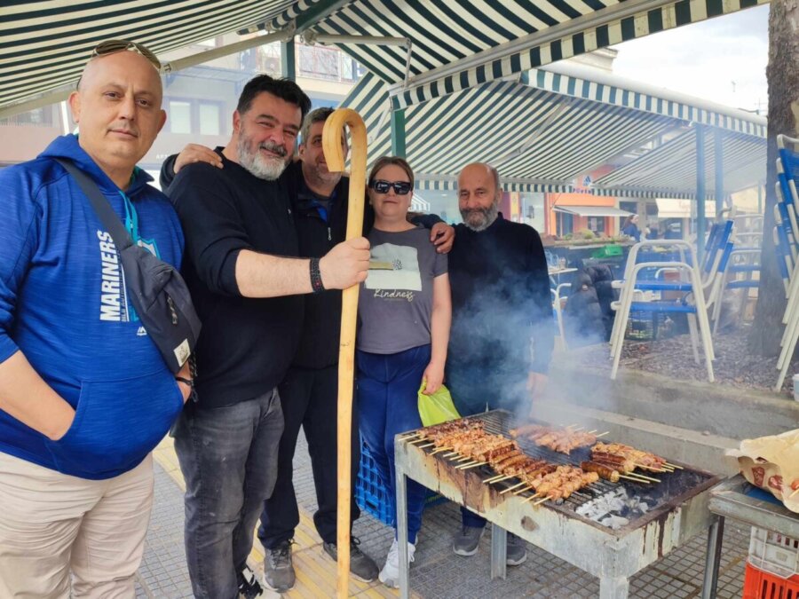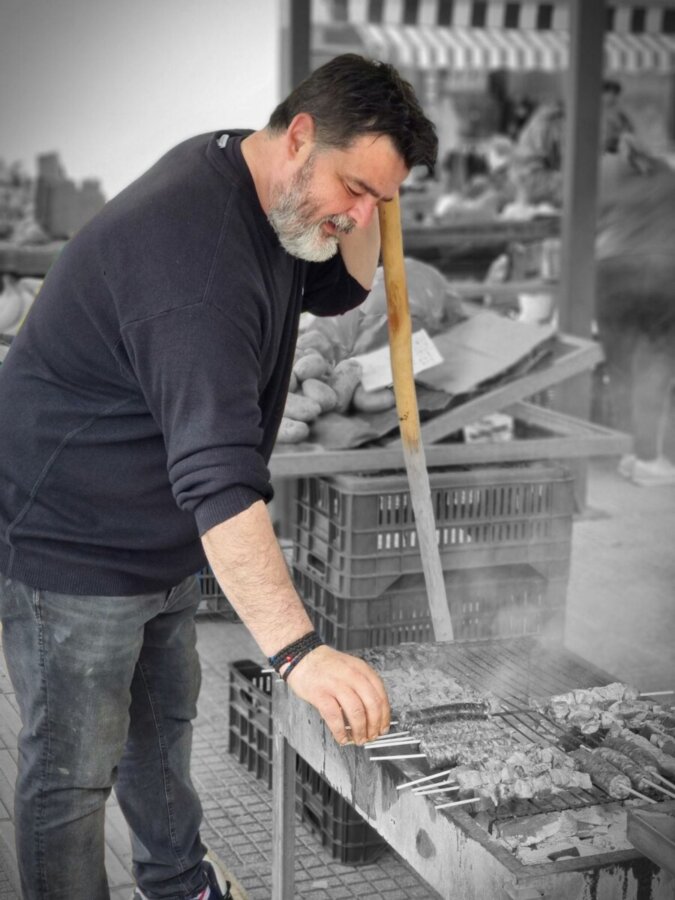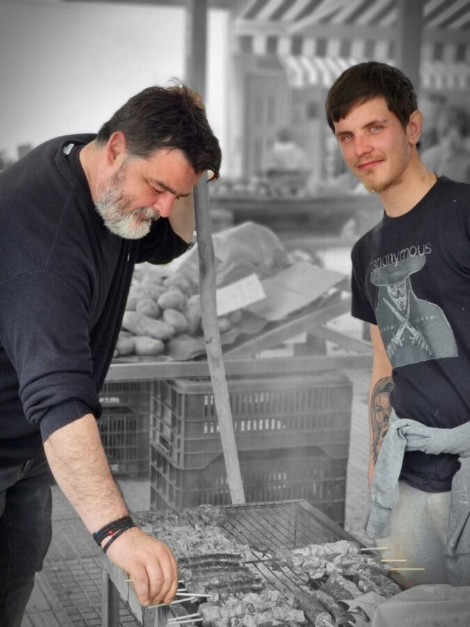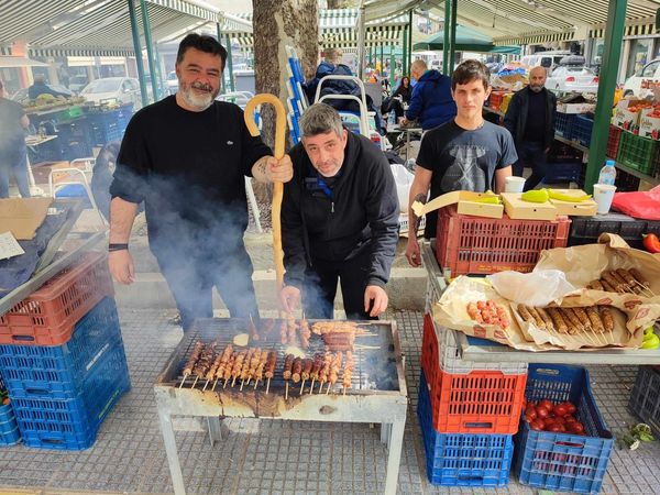 Μπροστά από τον πάγκο του Νίκου Παπακώστα και του Μπάμπη Μοσκόφογλου στήθηκε η ψησταριά και τα κάρβουνα … πήραν φωτιά! Σουβλάκια και λουκάνικα είχαν την τιμητική τους, ενώ δεν απουσίαζε το κρασί.