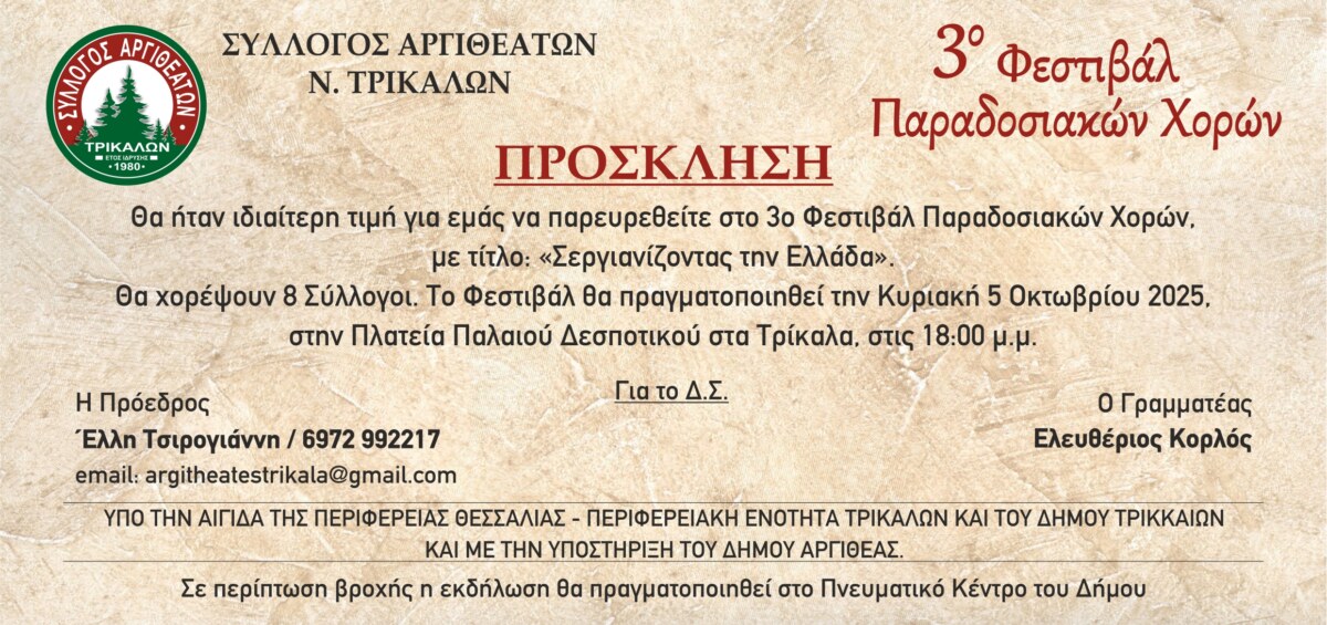 5 Οκτωβρίου όλοι οι δρόμοι των Τρικάλων οδηγούν στο 3ο Φεστιβάλ Παραδοσιακών χορών, του Συλλόγου Αργιθεατών στην πλατεία Παλαιού Δεσποτικού , ώρα 6 το απόγευμα.