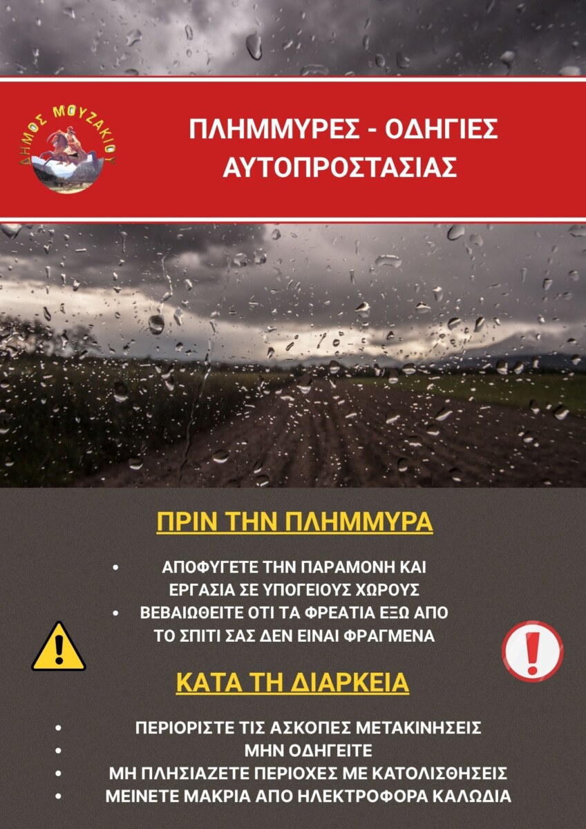 Ο Δήμος Μουζακίου και το Γραφείο Πολιτικής Προστασίας καλούν όλους τους πολίτες να ακολουθούν πιστά τα μέτρα αυτά για την προστασία της ζωής και της περιουσίας τους.