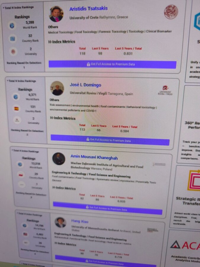 Στον τομέα τοξικολογία τροφίμων food toxicology το εργαστήριο μου βρίσκεται στην 8η θέση στον κόσμο με h index 71. Αυτό συνέβη από την ερευνητική δουλειά 133 προπτυχιακών , 70 μεταπτυχιακών και 18 διδακτορικών φοιτητών μου για 25 χρόνια . Όλους αυτούς τους ευχαριστώ γιατί μαζί τους μοιράστηκα το όραμα μου για την επιστημη μας. Εργάστηκα πολύ σκληρά μαζί τους . Με μερικούς κλάψαμε μαζί . Ταυτόχρονα να ευχαριστήσω και την Χαριτινη που με σκουντουσε τόσα βράδυα όταν έκλειναν τα μάτια μου από την κούραση , για να συνεχίσω . Όπως επίσης τους αοκνους συνεργάτες μου