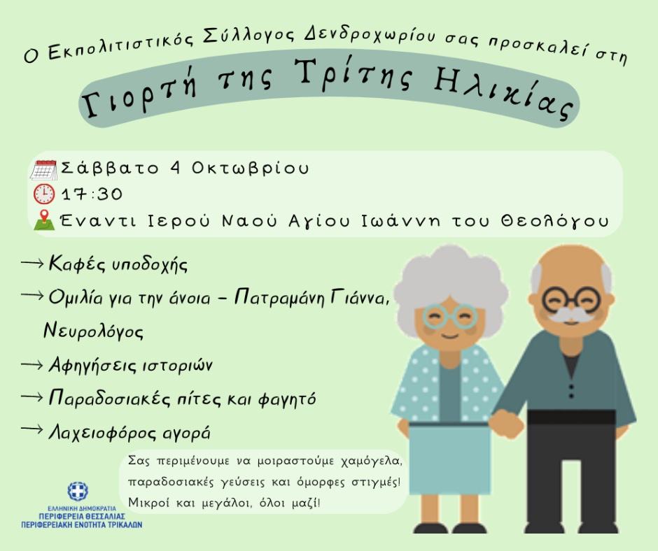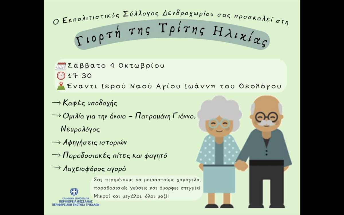 Μια όμορφη εκδήλωση, αφιερωμένη στους ανθρώπους της τρίτης ηλικίας, διοργανώνει το Σάββατο 4 Οκτωβρίου ο Εκπολιτιστικός Σύλλογος Δενδροχωρίου στις 5.30 μ.μ. έναντι του Ι. Ν. Αγίου Ιωάννη!