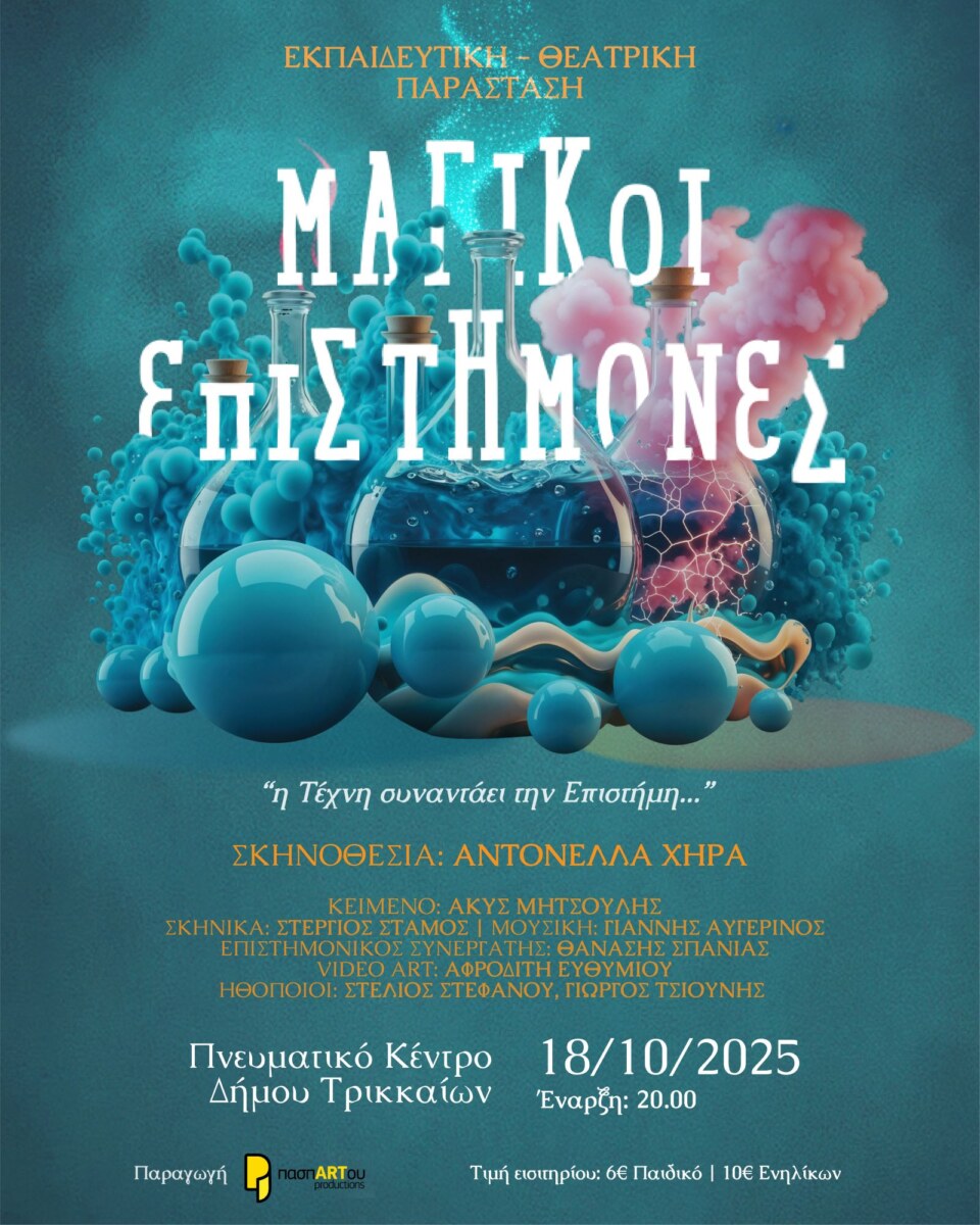 Η Εκπαιδευτική Θεατρική παράσταση «Οι Μαγικοί Επιστήμονες» σε σκηνοθεσία Αντονέλλας Χήρα μεταμορφώνει τη θεατρική σκηνή σε ένα σύγχρονο εργαστήρι πειραμάτων το Σάββατο 18 Οκτωβρίου στις 20:00 στο Πνευματικό Κέντρο Δήμου Τρικκαίων «Αθανάσιος Τριγώνης». Εκρήξεις, χημικές ενώσεις και αντιδράσεις, φωτιές και laser συνθέτουν το εντυπωσιακό σκηνικό μιας εκπαιδευτικής και κωμικής παράστασης.