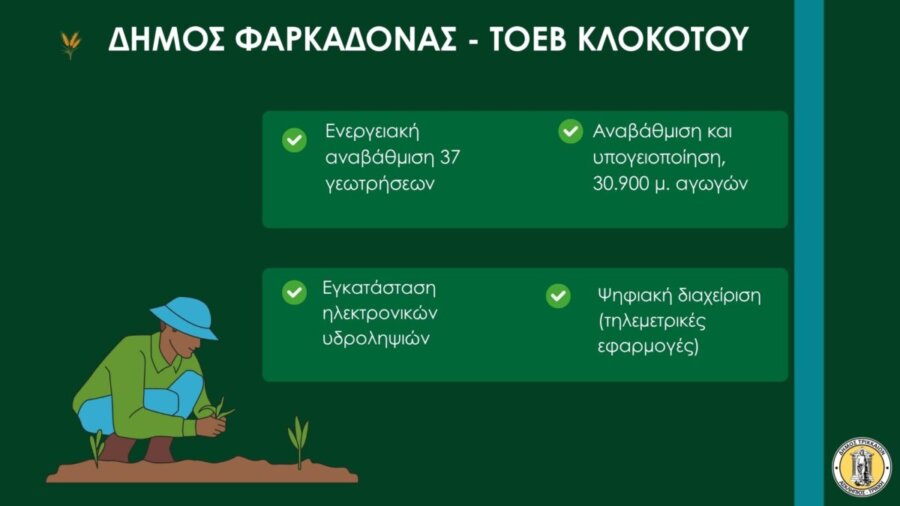 Δ. Στον Δήμο Φαρκαδόνας και στον ΤΟΕΒ Κλοκωτού το έργο προβλέπει