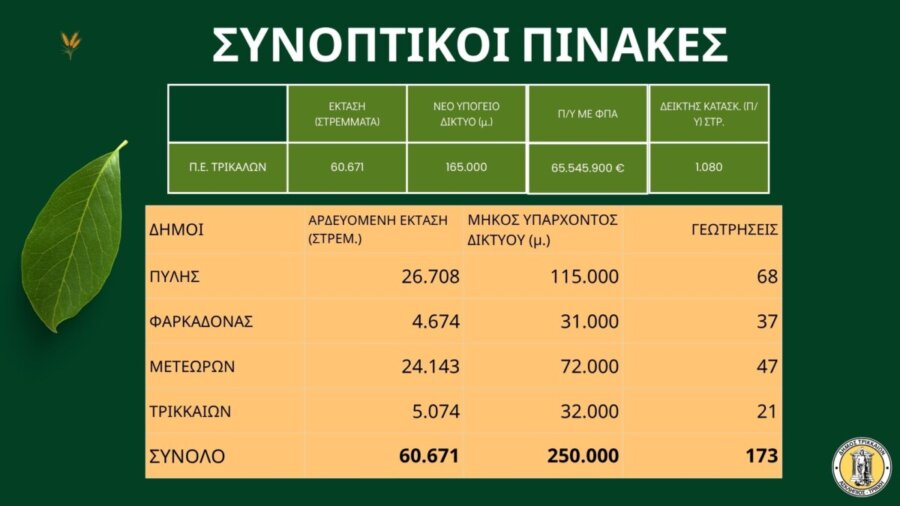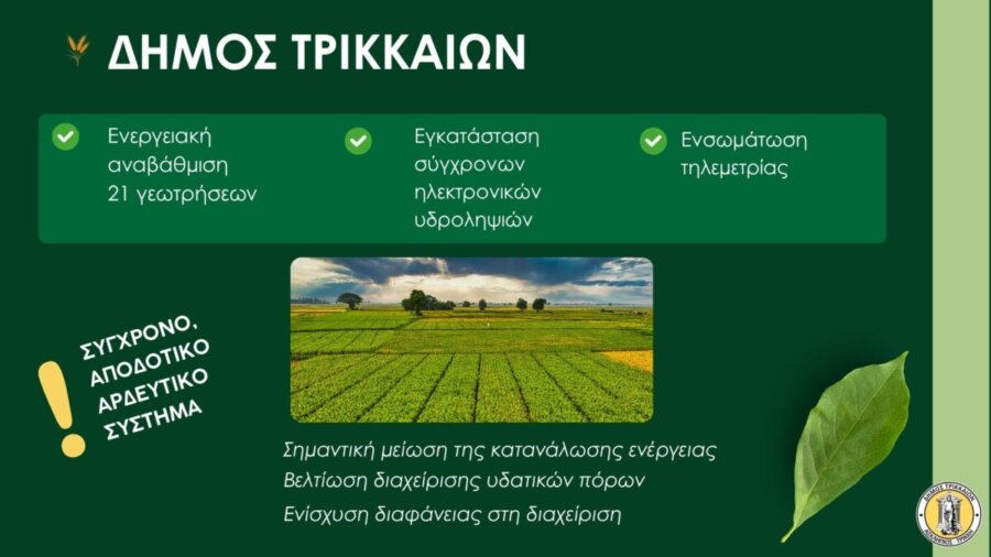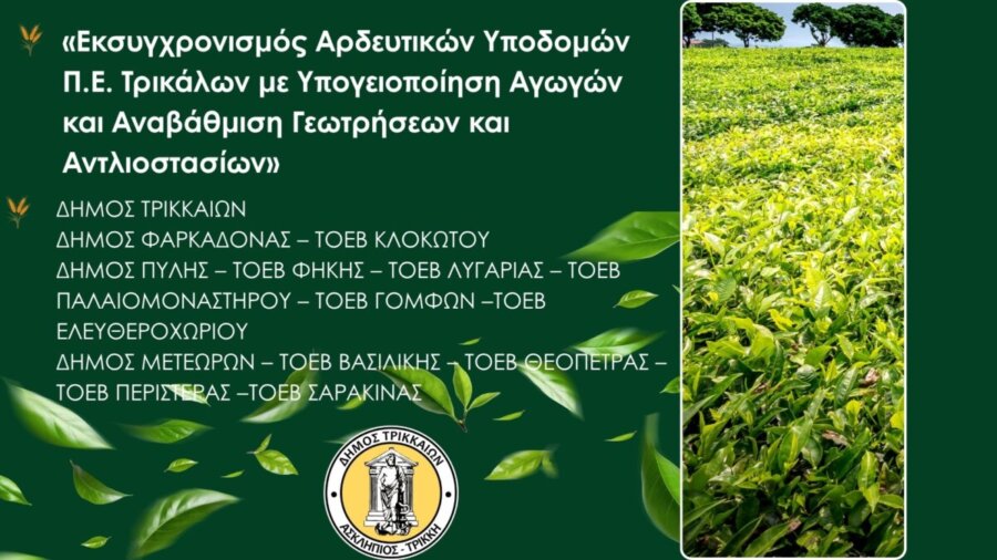 Πρόκειται για το έργο «Εκσυγχρονισμός Αρδευτικών Υποδομών Π.Ε. Τρικάλων (ΔΗΜΟΣ ΤΡΙΚΚΑΙΩΝ – ΔΗΜΟΣ ΦΑΡΚΑΔΟΝΑΣ – ΤΟΕΒ ΚΛΟΚΩΤΟΥ – ΔΗΜΟΣ ΠΥΛΗΣ – ΤΟΕΒ ΦΗΚΗΣ – ΤΟΕΒ ΛΥΓΑΡΙΑΣ – ΤΟΕΒ ΠΑΛΑΙΟΜΟΝΑΣΤΗΡΟΥ – ΤΟΕΒ ΓΟΜΦΩΝ –ΤΟΕΒ ΕΛΕΥΘΕΡΟΧΩΡΙΟΥ ΔΗΜΟΣ ΜΕΤΕΩΡΩΝ – ΤΟΕΒ ΒΑΣΙΛΙΚΗΣ – ΤΟΕΒ ΘΕΟΠΕΤΡΑΣ – ΤΟΕΒ ΠΕΡΙΣΤΕΡΑΣ –ΤΟΕΒ ΣΑΡΑΚΙΝΑΣ) με Υπογειοποίηση Αγωγών και Αναβάθμιση Γεωτρήσεων και Αντλιοστασίων».