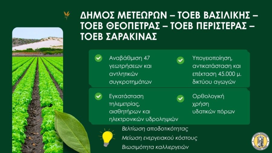 Α. Στον Δήμο Μετεώρων και στους ΤΟΕΒ Βασιλικής, Θεόπετρα, Περιστέρας και Σαρακίνας το έργο προβλέπει