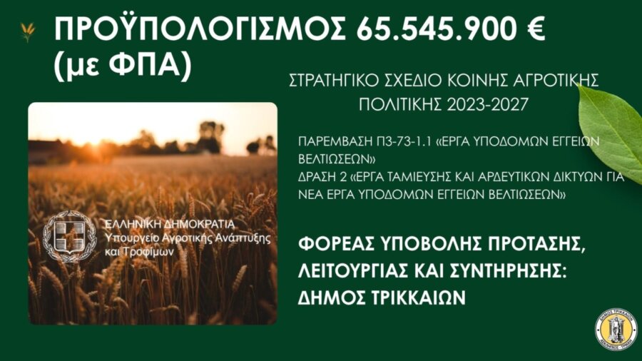 Το μεγαλύτερο έργο που έχει υλοποιήσει Δήμος στον νομό Τρικάλων, για όλον τον νομό Τρικάλων και μάλιστα για τους αγρότες και το περιβάλλον, υπέβαλε προς έγκριση ο Δήμος Τρικκαίων.