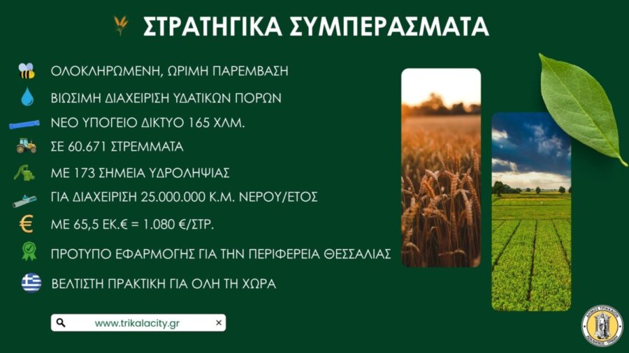 Με το έργο αυτό, σημείωσε ο Δήμαρχος Τρικκαίων «δίνουμε νέα, ορθολογική πνοή στη διαχείριση υδάτων, σε περίοδο λειψυδρίας, μειώνοντας απώλειες, εισάγοντας ψηφιακές λύσεις. Κυρίως, τόνισε «στηρίζουμε έμπρακτα τους αγρότες, ενώ συνδέουμε τον πρωτογενή τομέα με την τεχνολογία».