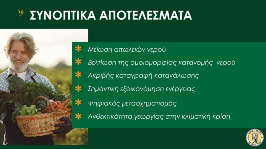 Με χαμηλή δαπάνη με πλήρη αναβάθμιση αρδευτικών υποδομών, επιτυγχάνεται πλήρης αναβάθμιση των αρδευτικών υποδομών, με υπογειοποιήσεις, αντλιοστάσια, υδροληψίες, τηλεμετρία, ψηφιακά δίδυμα, με σημαντικά ενεργειακά, υδατικά, περιβαλλοντικά οφέλη.