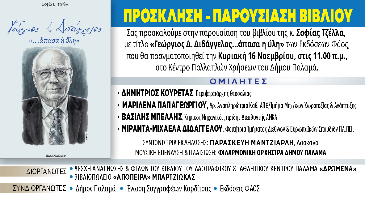 Πρόκειται για το βιβλίο της κ. Σοφίας Τζέλα με τίτλο Γεώργιος Δ. Διδάγγελος…Άπασα η ύλη”. Για το βιβλίο θα μιλήσουν ο Περιφερειάρχης Θεσσαλίας Δημήτρης Κουρέτας, η καθηγήτρια του ΑΠΘ Μαριλένα Παπαγεωργίου, ο πρώην διευθυντής ΑΝΚΑ Βασίλης Μπέλλης και η φοιτήτρια Μιράντα- Μιχαέλα Διδάγγελου.