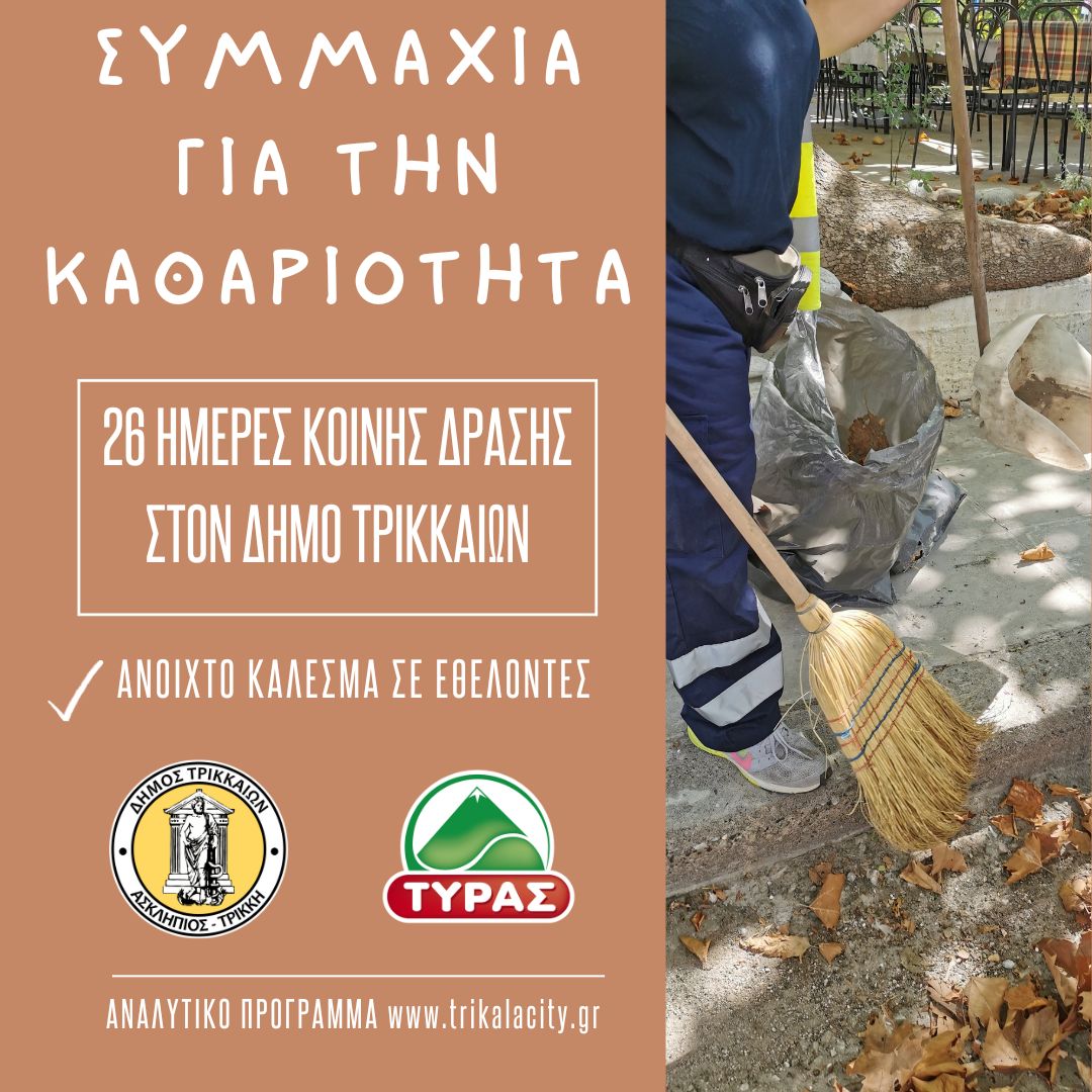 Μια σημαντική δράση υλοποιούν από κοινού ο Δήμος Τρικκαίων και η ΤΥΡΑΣ, μετά από πρωτοβουλία της τρικαλινής εταιρείας. Από την Παρασκευή 21 Νοεμβρίου 2025 και για 26 εργάσιμες ημέρες, οι υπηρεσίες του Δήμου (Δ/νση Ανταποδοτικών Υπηρεσιών), η εταιρεία και εθελοντές της, θα προβαίνουν σε καθαρισμό σημείων της πόλης και σε συνοικισμούς. Με γενικό σύνθημα «Καθαρίζουμε – Προσφέρουμε – Ομορφαίνουμε», η δράση απευθύνεται και σε όλους τους πολίτες. Στόχος, ο μέγιστος δυνατός ευπρεπισμός της πόλης, η καθαρή γειτονιά, το όμορφο περιβάλλον.