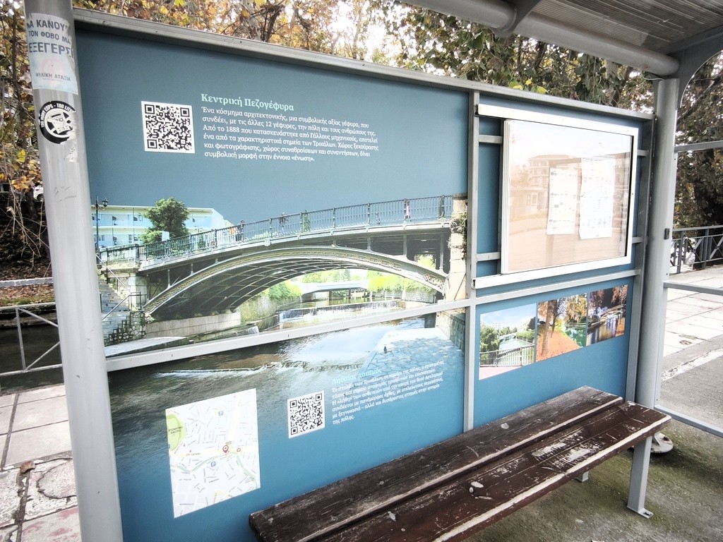Τρεις στάσεις του Αστικού ΚΤΕΛ “ντύθηκαν” με προσεγμένες πληροφοριακές πινακίδες, που αποτυπώνουν ισάριθμα τοπόσημα της πόλης: Μουσείο Τσιτσάνη, Τζαμί, κεντρική πεζογέφυρα.