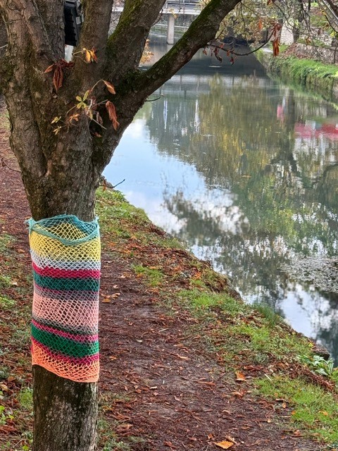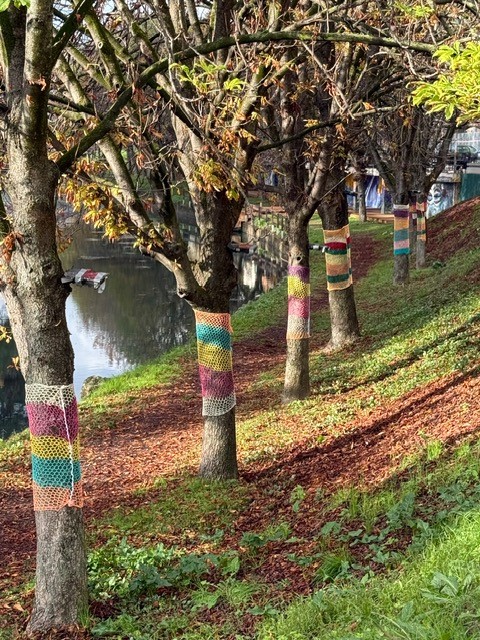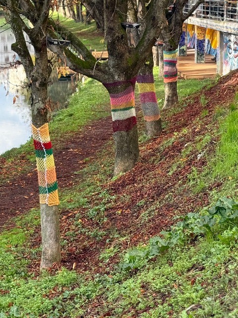Στη συνέχεια, τα έργα τοποθετήθηκαν στους κορμούς των δέντρων, προσφέροντας μία εικόνα χαράς και ζεστασιάς σε όσους περνούν από το σημείο.