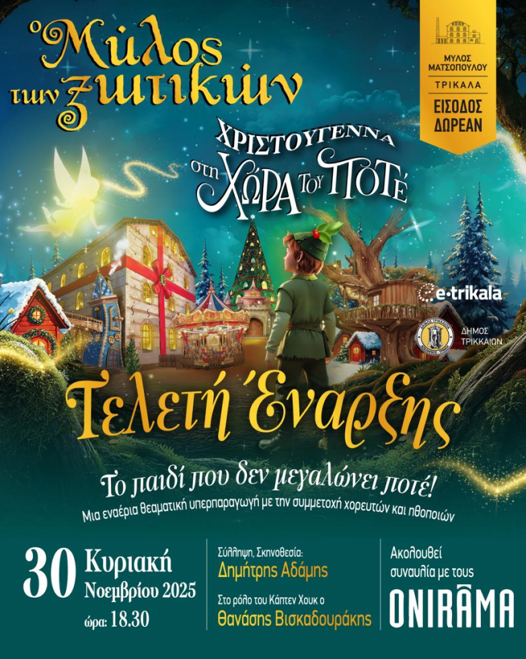 ”Το παιδί που δεν μεγαλώνει ποτέ” τιτλοφορείται η τελετή έναρξης του 14ου Μύλου των Ξωτικών, που για φέτος θα πραγματοποιηθεί την Κυριακή 30 Νοεμβρίου 2025.