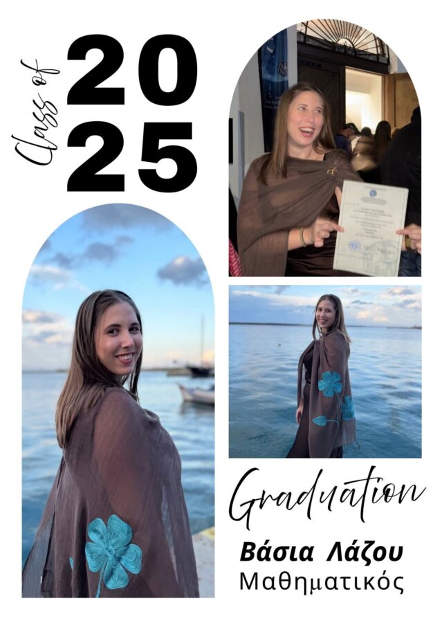 Η πρωτότοκη κόρη τους Βάσια ,αποφοίτησε και πήρε το πτυχίο της από το τμήμα Μαθηματικών του Πανεπιστημίου Αιγαίου στη Σάμο ,μετά από τέσσερα χρόνια σκληρής δουλειάς και αφοσίωσης στην επιστήμη που αγαπά .
