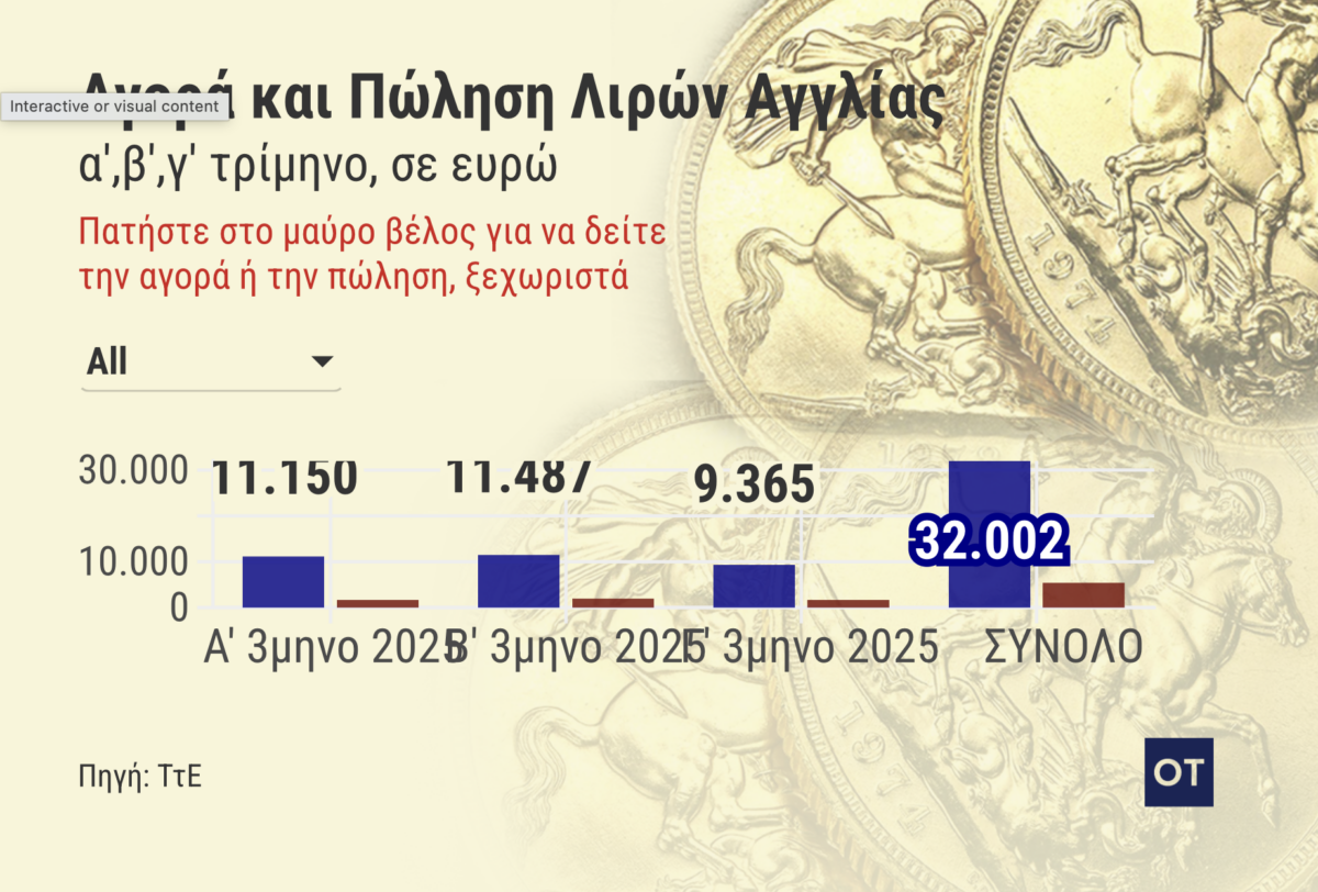 Σύμφωνα με στοιχεία, στο τρίτο τρίμηνο 2025, οι ιδιώτες αγόρασαν από την Τράπεζα της Ελλάδος (ΤτΕ) μόλις 1.714 χρυσές λίρες, ενώ πούλησαν προς την ΤτE 9.365 χρυσές λίρες.