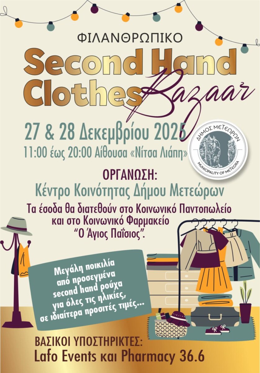Το Κέντρο Κοινότητας Δήμου Μετεώρων διοργανώνει ένα Φιλανθρωπικό Second Hand Clothes Bazaar, το οποίο θα πραγματοποιηθεί τo Σάββατο 27 και την Κυριακή 28 Δεκεμβρίου 2025, από 11:00 το πρωί έως τις 20:00 το βράδυ, στην Αίθουσα «Νίτσα Λιάπη».