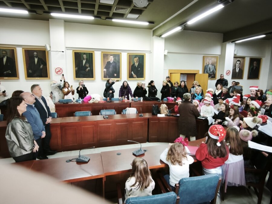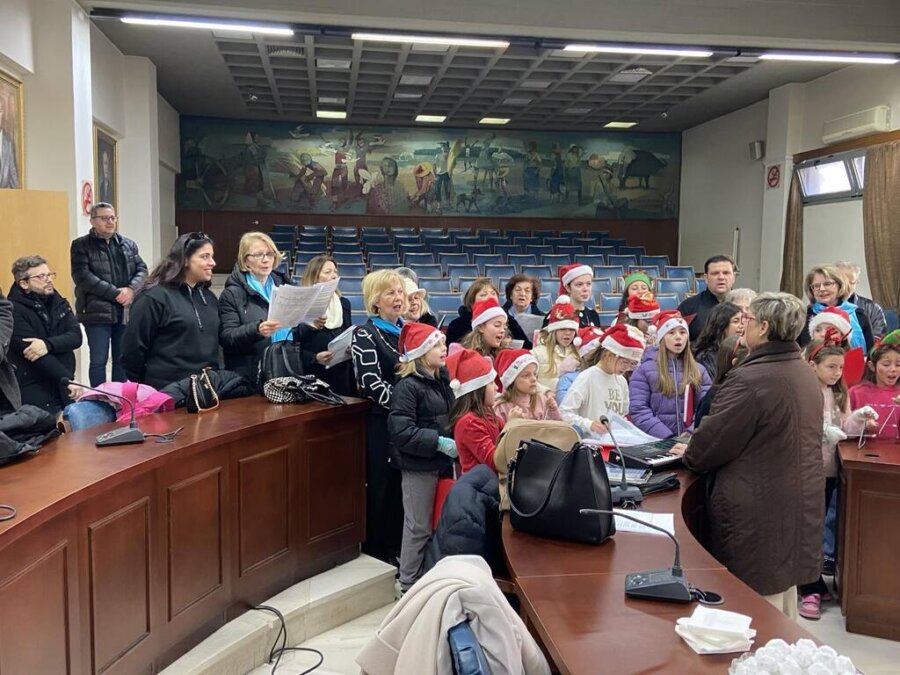 Τα μέλη της Παιδικής Χορωδίας του Δημοτικού Ωδείου Τρικάλων επισκέφθηκαν το Δημαρχείο Τρικκαίων τη Δευτέρα 29 Δεκεμβρίου 2025, ψάλλοντας κάλαντα στον κ. Σακκά και στου αντιδημάρχους Σοφία Αλεστά και Μιχάλη Λάππα.
