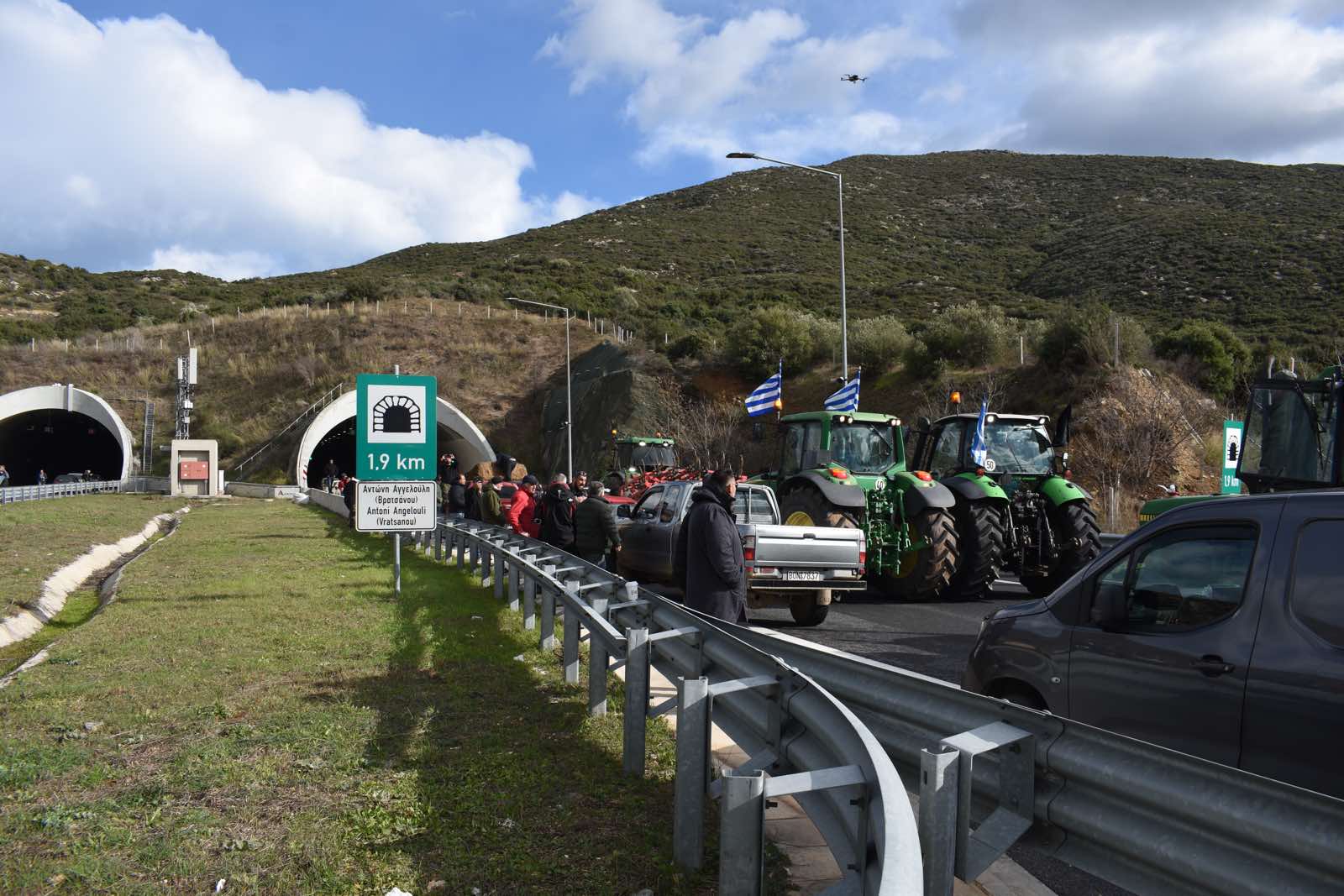 Τρακτέρ και αγροτικά μηχανήματα παραμένουν παρατεταγμένα στη σήραγγα, με τη συμμετοχή του μπλόκου της Νίκαιας, στο πλαίσιο της κλιμάκωσης των κινητοποιήσεών τους.
