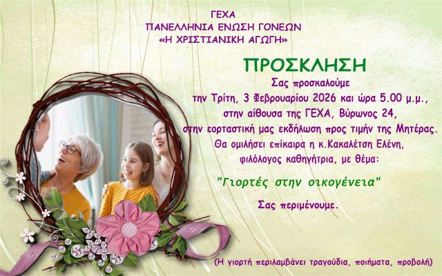 Την Τρίτη 3 Φεβρουαρίου 2026 και ώρα 5:00 μ.μ. στην αίθουσα της Γ.Ε.Χ.Α., Βύρωνος 24, θα πραγματοποιηθεί εορταστική εκδήλωση προς τιμήν της Μητέρας. Θα ομιλήσει επίκαιρα η κ. Κακαλέτση Ελένη, φιλόλογος καθηγήτρια, με θέμα “Γιορτές στην οικογένεια”.
