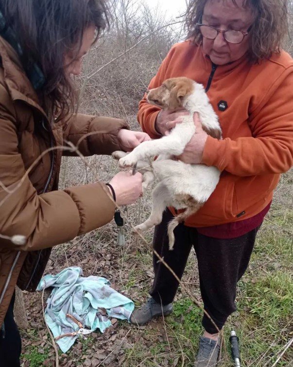 Η τριών μηνών σκυλίτσα βρέθηκε στις 24 Ιανουαρίου από μια κάτοικο της περιοχής που είχε βγάλει βόλτα το σκυλάκι της. Άκουσε τις κραυγές πόνου του κουταβιού και έσπευσε να καλέσει σε βοήθεια μέλη φιλοζωικής ομάδας. Το 3 μηνών σκυλάκι ήταν δεμένο από το λαιμό στο δένδρο με μια ζώνη παντελονιού ενώ ένα σχοινί ήταν δεμένο σφιχτά στο λαιμό του και το δεξί με το αριστερό πόδι είχαν δεθεί σφιχτά.