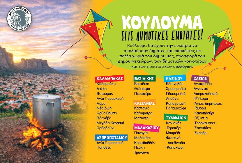 Οι εκδηλώσεις ολοκληρώνονται με το παραδοσιακό έθιμο της φασολάδας, που θα πραγματοποιηθεί στην Καλαμπάκα και στα χωριά του Δήμου, με σαρακοστιανά κεράσματα, μουσική και γιορτινή ατμόσφαιρα, κρατώντας ζωντανά τα ήθη και τα έθιμα της περιοχής. Ο Δήμος Μετεώρων καλεί όλους να συμμετάσχουν και να μοιραστούν στιγμές χαράς, παιχνιδιού και παράδοσης. Η είσοδος σε όλες τις εκδηλώσεις είναι ελεύθερη.