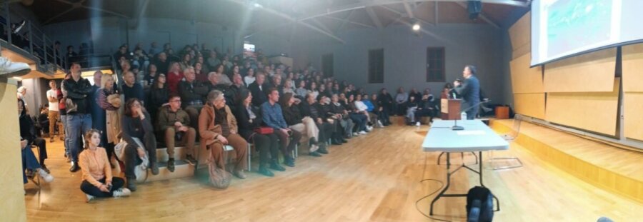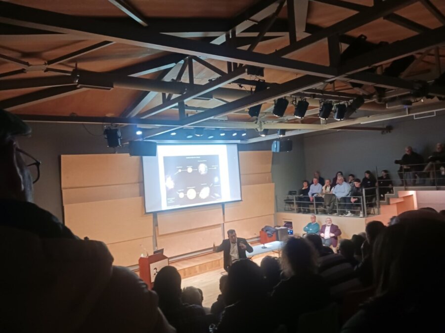 Η ομιλία ταξίδεψε το κοινό, από τη γέννηση του Σύμπαντος έως τα σύγχρονα κοσμολογικά ερωτήματα γύρω από τη Σκοτεινή Ενέργεια, παρουσιάζοντας βασικές έννοιες της σύγχρονης κοσμολογίας με τρόπο κατανοητό και προσιτό.