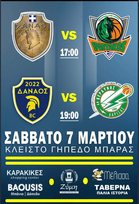 Ο ΑΣ Δαναοί και ο Δαναός 2022 καλεί όλους τους φίλους του μπάσκετ στα παιχνίδια εναντίον του Σπάρτακου Λάρισας και του Κεραυνού Λάρισας αντίστοιχα, που θα διεξαχθούν το Σάββατο 7 Μαρτίου και ώρες 17.00 και 19.00 στο ΕΑΚ της Μπάρας για την 20η αγωνιστική του πρωταθλήματος της Α1 ΕΣΚΑΘ.