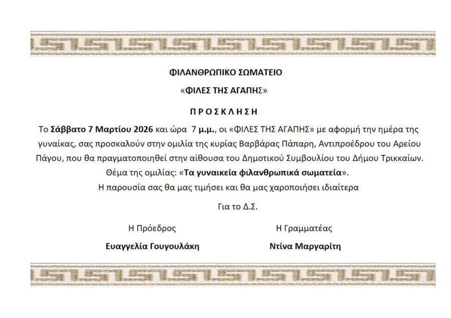 Το φιλανθρωπικό σωματείο της πόλης μας οι “Φίλες της Αγάπης” σας προσκαλούν ,το Σάββατο 7 Μαρτίου 2026 στις 7.00.μμ στην αίθουσα του Δημοτικού συμβουλίου του Δήμου Τρικκαίων,σε μια ενδιαφέρουσα ομιλία με αφορμή την ημέρα της γυναίκας.