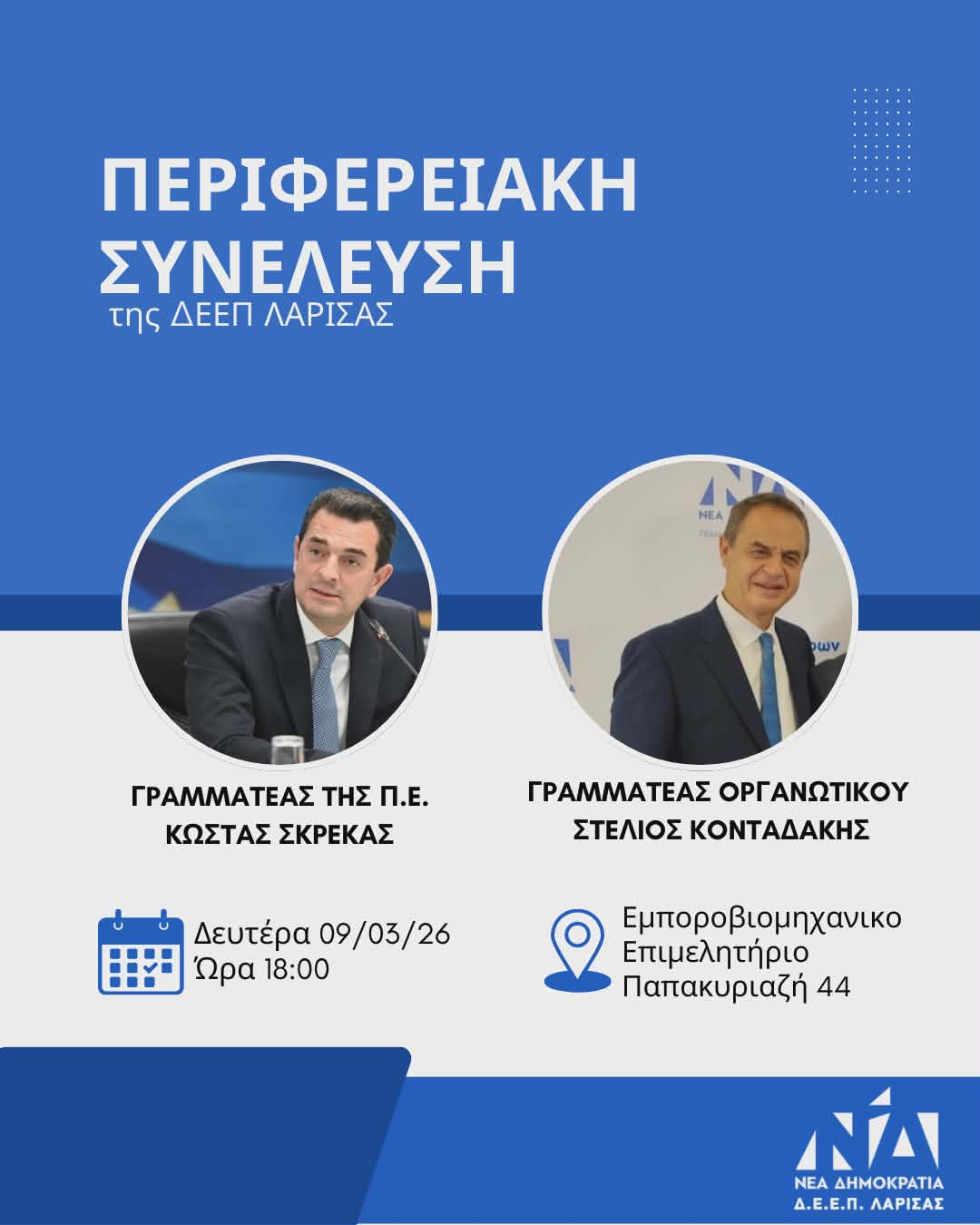 Kλιμάκιο της Νεας Δημοκρατίας με επικεφαλής τον γραμματέα της Πολιτικής Επιτροπής, Κώστα Σκρέκα, και τον γραμματέα Οργανωτικού, Στέλιο Κονταδάκη, θα βρίσκεται στη Λάρισα τη Δευτέρα, στο πλαίσιο προγραμματισμένων δράσεων επικοινωνίας με τα κομματικά στελέχη και του προσυνεδριακού διαλόγου.