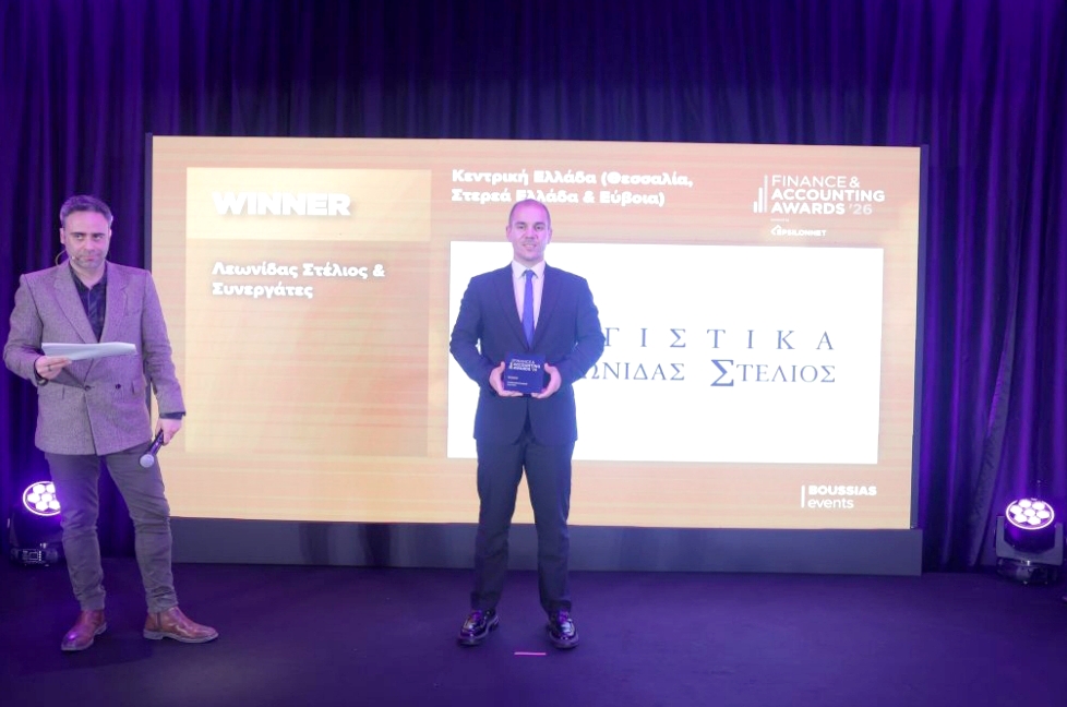 Με το Gold βραβείο ως καλύτερο γραφείο στην περιφέρεια Θεσσαλίας, Στερεάς Ελλάδας & Εύβοιας, τιμήθηκε το λογιστικό γραφείο «Λεωνίδας Στέλιος & Συνεργάτες» στα Finance & Accounting Awards 2026 powered by Epsilon Net, που διοργάνωσε η Boussias.