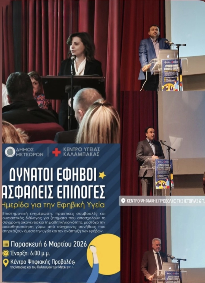 Με ιδιαίτερη χαρά και αίσθημα ευθύνης το Κέντρο Υγείας Καλαμπάκας διοργάνωσε σε συνεργασία με τον Δήμο Μετεώρων, την Παρασκευή 6 Μαρτίου 2026 στο Κέντρο Ψηφιακής Προβολής της Ιστορίας και του Πολιτισμού των Μετεώρων στην Καλαμπάκα, την ημερίδα για την Εφηβική Υγεία, με θέμα: