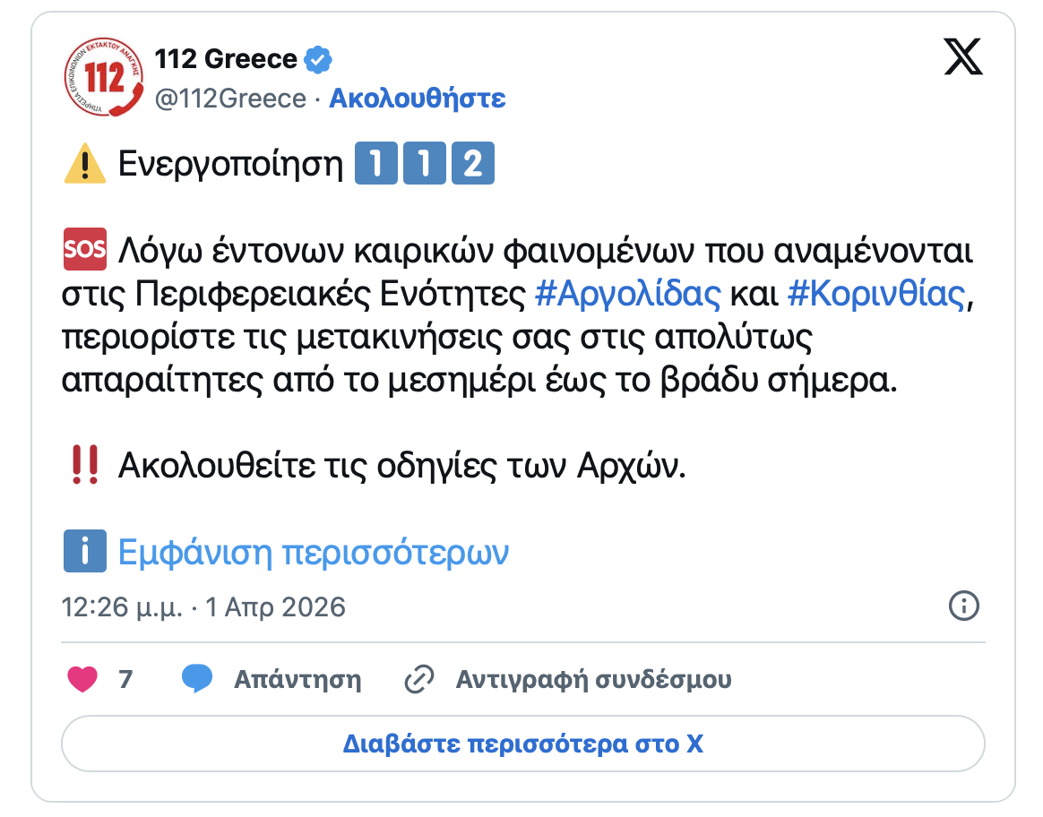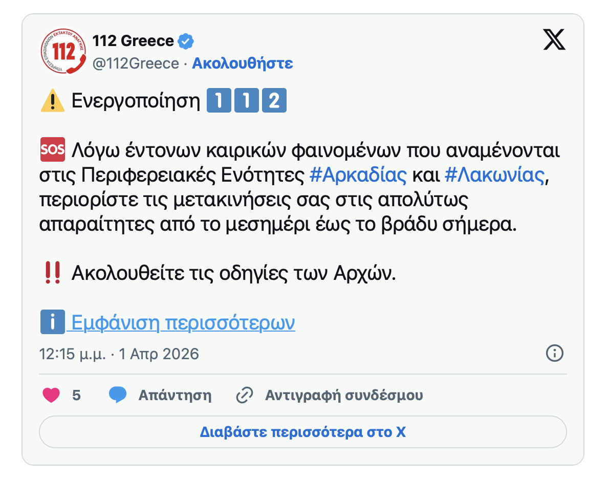 Νωρίτερα συνεδρίασε και πάλι η Επιτροπή Εκτίμησης Κινδύνου στην Πολιτική Προστασία, ενώ πριν από λίγο ενεργοποιήθηκε το 112 για τους νομούς Λακωνίας, Αρκαδίας, Αργολίδας και Κορινθίας καλώντας του πολίτες να περιορίσουν τις μετακινήσεις τους.