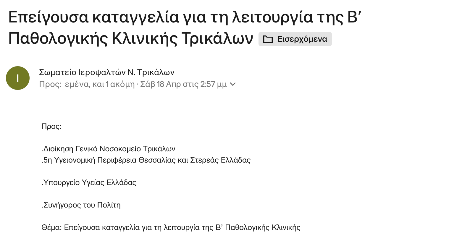 Η καταγγελία που λάβαμε είχε ως αποστολέα το Σωματείο Ιεροψαλτών Ν. Τρικάλων και ως αποδέκτες -πέρα από το μέσο μας-, την Διοίκηση του Γενικού Νοσοκομείου Τρικάλων, την 5η Υγειονομική Περιφέρεια Θεσσαλίας και Στερεάς Ελλάδας, το Υπουργείο Υγείας Ελλάδας και τον Συνήγορο του Πολίτη, όπως φαίνεται παρακάτω.