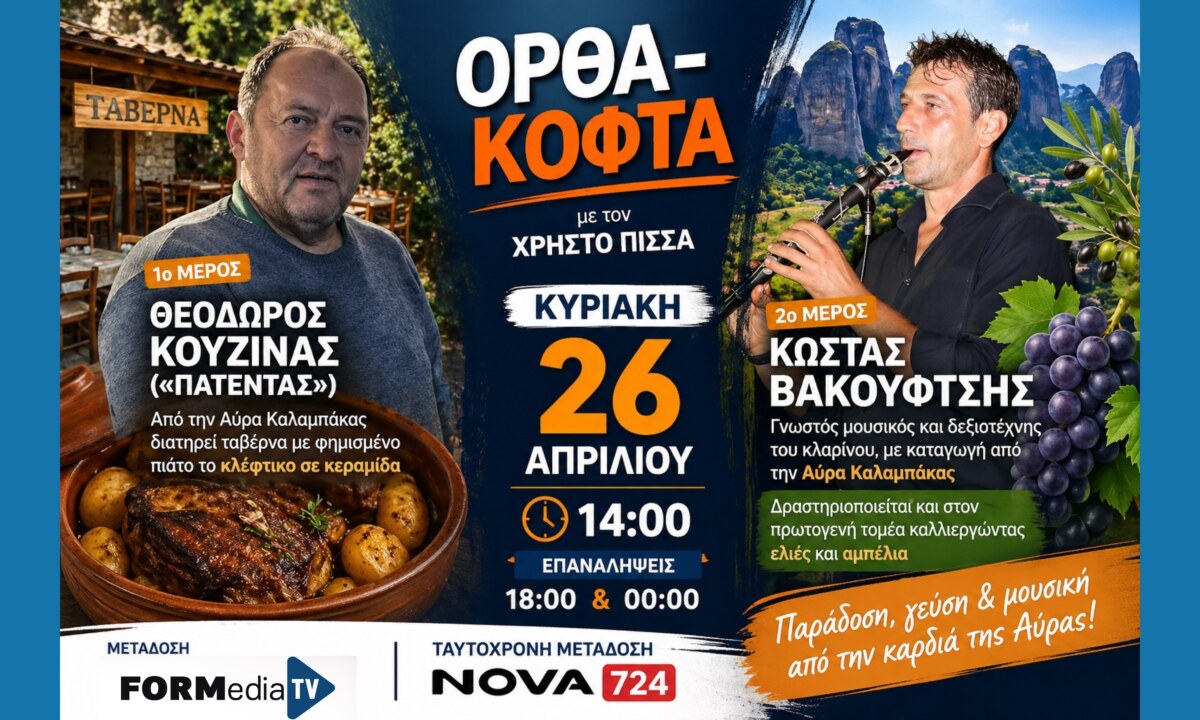 Η ενημερωτική εκπομπή «Ορθά-Κοφτά» με τον Χρήστο Πίσσα επιστρέφει και την Κυριακή, με άρωμα παράδοσης, γεύσης και μουσικής από την περιοχή της Καλαμπάκας.